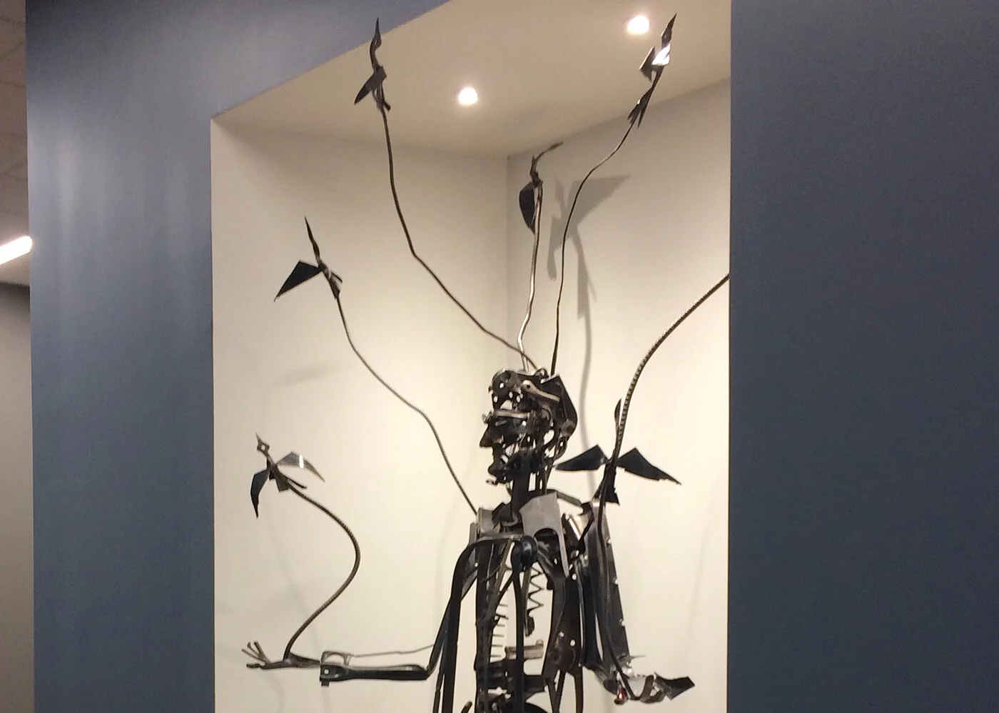 Scrap metal pieces themselves trigger my imagination to create these animal sculptures. Every piece has its own history and memory, bent, torn and rusted from being used outdoors for a long time. They are lifelike and organic in that sense. Looking at them inspires me and almost instinctively I see, for example, a dog’s head, a bird’s leg, or a deer’s back. Then in response I go and find other pieces that could fit to create the whole animal.
